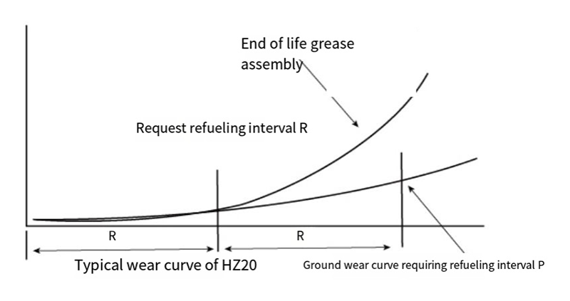 Materiał HZ20 podlega specjalnym zasadom zużycia, jak pokazano na rys. 4. Podczas nakładania smaru i montażu może wystąpić nieskończenie małe ścieranie w fazie R. Ale po fazie R. stan smarowania granicznego zniknie, a zużycie będzie nadmierne. Jeśli uzupełnisz olejem. produkt może być w znacznym stopniu utrzymany dzięki nie rzucającemu się w oczy noszeniu, a jego żywotność również zostanie znacznie wydłużona. Dlatego zaletą materiału HZ20 jest to, że olej należy dodawać z dodatkiem