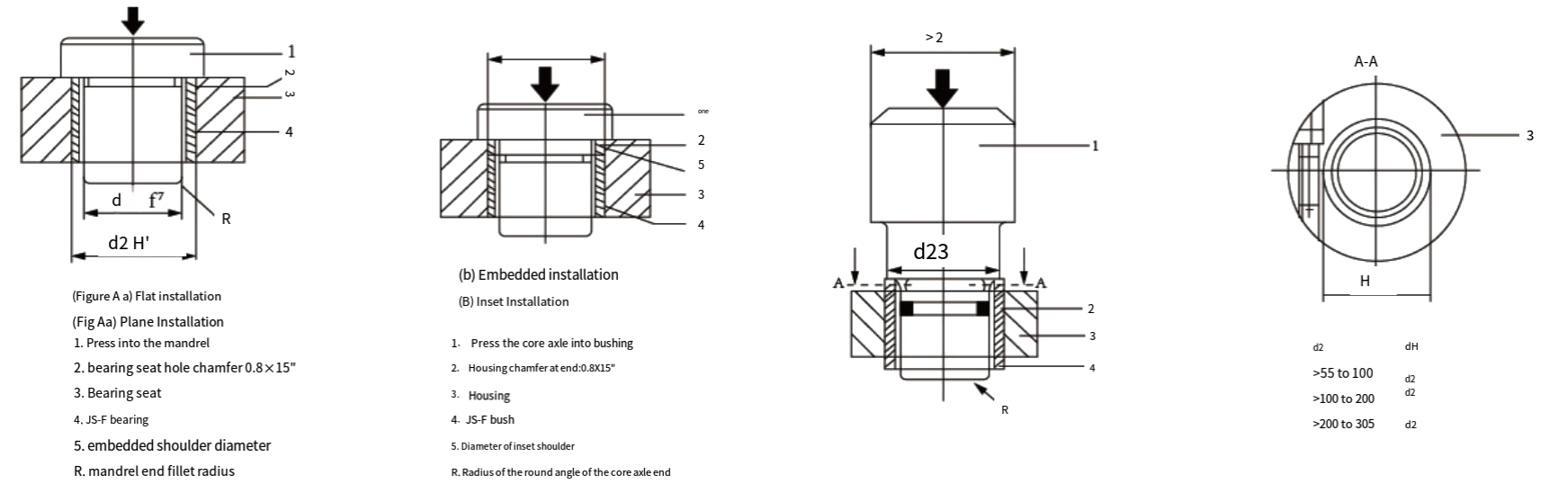 Tuleje HZ należy oczyścić w nafcie lub oleju napędowym, zanurzyć w oleju silnikowym i następnie wysuszyć. Kiedy tuleja jest instalowana w obudowie, należy upewnić się, że tuleja nie obraca się w obudowie ani nie porusza się w kierunku osiowym, a jednocześnie sprawia, że powierzchnia zewnętrzna całkowicie styka się z otworem podstawy, ogólnie gwarantując powierzchnię styku powyżej 7o%, poprawiając w ten sposób nośność i przenoszenie ciepła tarcia. Wewnętrzna powierzchnia tulei HZ wykonana jest z samosmarującego tworzywa sztucznego, zewnętrzna powierzchnia jest podkładem stalowym. Współczynnik tarcia stali o stal jest większy niż stali o plastiku, dlatego powinniśmy wybrać lekkie pasowanie ciasne, zapobiegające przesuwaniu się tulei osi w podstawie podczas pracy, a także zapobiegające deformacji i zbyt dużemu otworowi wewnętrznemu ze względu na duże ciasne pasowanie średnicy zewnętrznej.