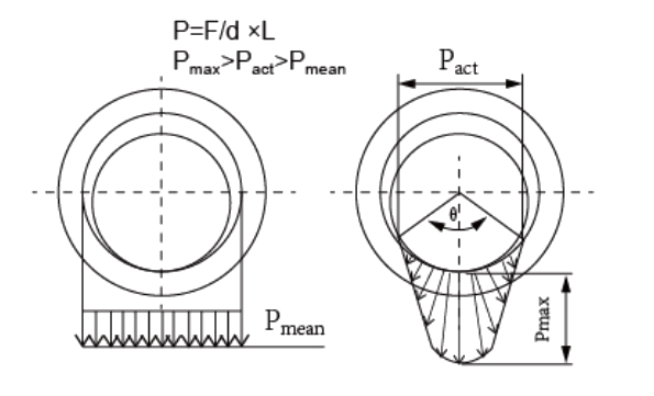 Jako współczynnik luzu stosuje się fazę tulei, rowek olejowy itp. Rzeczywiste obciążenie (Pakt) jest wyższe niż teoria obliczeń (Pmean).